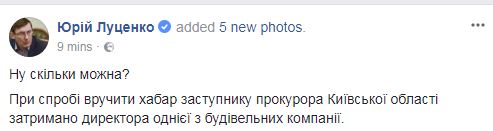 При попытке вручить взятку заместителю прокурора Киевской области задержан директор одной из строительных компании. Об этом пишет Генпрокурор Юрий Луценко на своей странице в Facebook.
