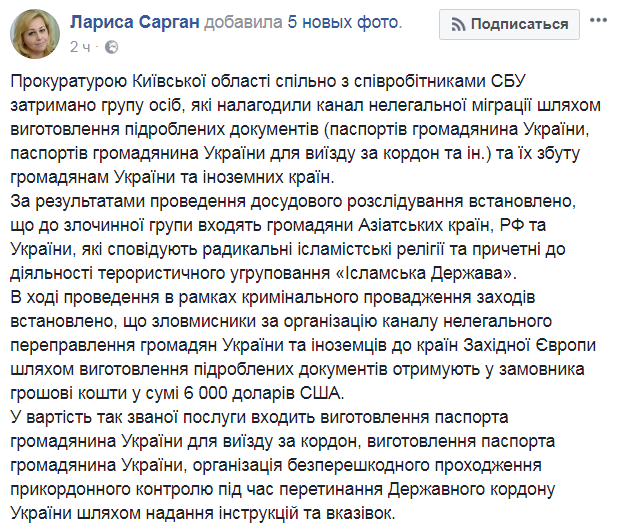 В Киевской области задержана группа подозреваемых причастности к террористам ИГИЛ и создании канала нелегальной миграции через госграницу при помощи выпуска поддельных документов.