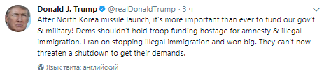 "После ракетного запуска КНДР сейчас важно как никогда финансировать наше правительство и бюджет. Демократы не должны держать финансирование войск в заложниках за амнистию и незаконную иммиграцию. Я победил на обещаниях остановить незаконную иммиграцию. Они сейчас угрожают закрытием (правительства - Прим.Ред.), чтобы добиться своего", - написал президент США.