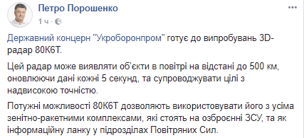 Петр Порошенко сообщил, что госконцерн "Укроборонпром" готовит к испытаниям 3D-радар 80К6Т, способный обнаруживать объекты в воздухе на расстоянии до 500 км. Об этом он написал в Facebook.