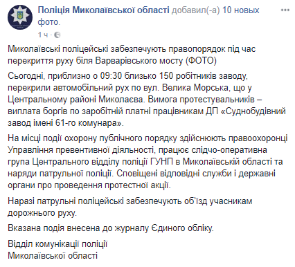 "Сегодня, примерно в 09:30 около 150 рабочих завода перекрыли автомобильное движение по ул. Большая Морская, в центральном районе Николаева. Требование протестующих - выплата долгов по заработной плате", - говорится в сообщении.