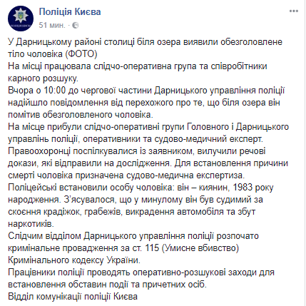 В Киеве прохожий обнаружил обезглавленный труп мужчины возле озера в Дарницком районе города. Об этом в Facebook сообщает полиция Киева.