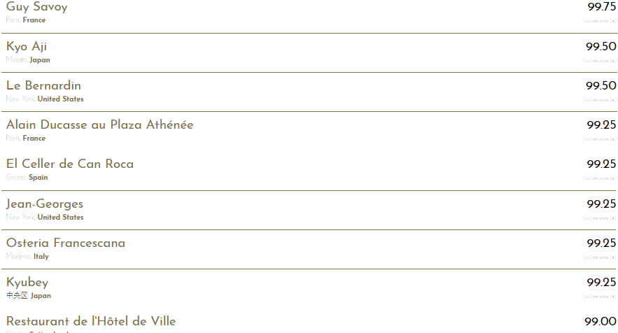 В рейтинге оценивается не только работа повара, но и все заведение целиком, максимальная оценка, которую может получить ресторан - 100 баллов. Guy Savoy набрал 99,75 баллов.