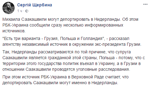 Щербина утверждает, что источник в Верховной Раде считает, что депортировать Саакашвили могут именно в Нидерланды.
