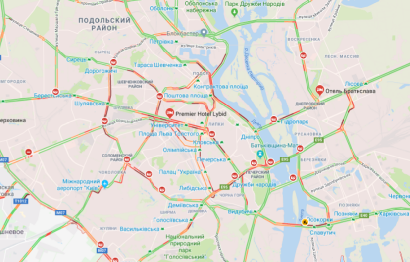 Проблемы с загруженностью возникли и на других улицах в центре Киева: на Метромосту, улице Елены Телиги и проспекте Победы в районе цирка.
