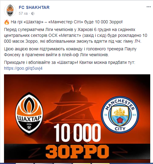 На игре с грозными "горожанами", в которой Шахтеру хватит и ничьей, чтобы выйти из группы, донецкую команду поддержат 10 000 Зорро.