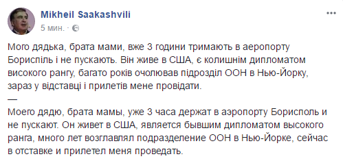 "Моего дядю, брата мамы, уже 3 часа держат в аэропорту Борисполь и не пускают. Он живет в США, является бывшим дипломатом высокого ранга, много лет возглавлял подразделение ООН в Нью-Йорке, сейчас в отставке и прилетел меня проведать", - написал Саакашвили.