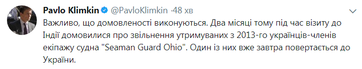 "Важно, что договоренности выполняются. Два месяца назад во время визита в Индию договорились об освобождении удерживаемых с 2013-го украинцев-членов экипажа судна "Seaman Guard Ohio". Один из них уже завтра возвращается в Украину", - сообщил глава МИД.
