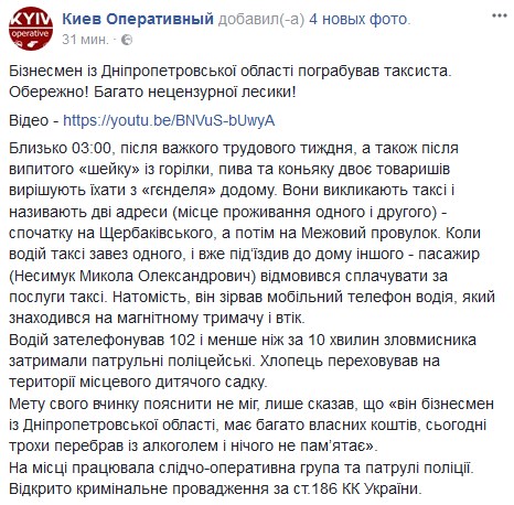 Когда водитель такси завезут друга, и уже подъезжал к дому другой - пассажир Несимук Николай Александрович отказался платить за услуги такси. Вместо этого, он сорвал мобильный телефон водителя, который находился на магнитном держателю и убежал.