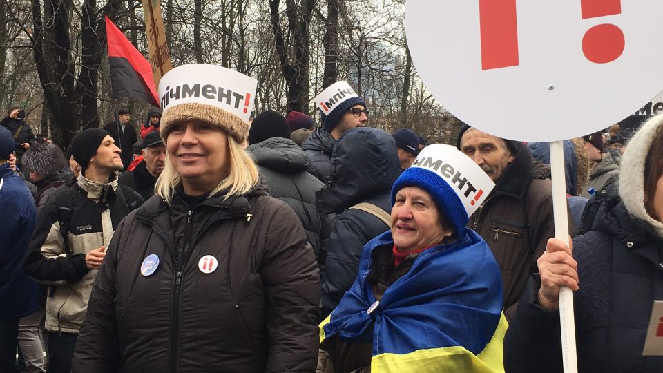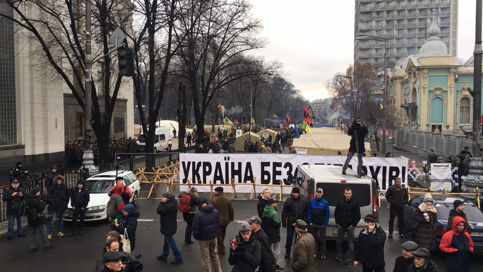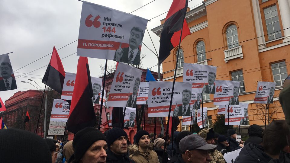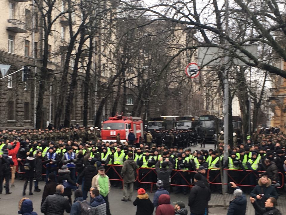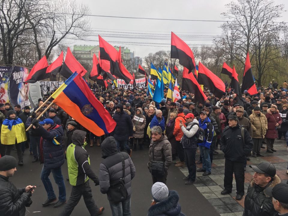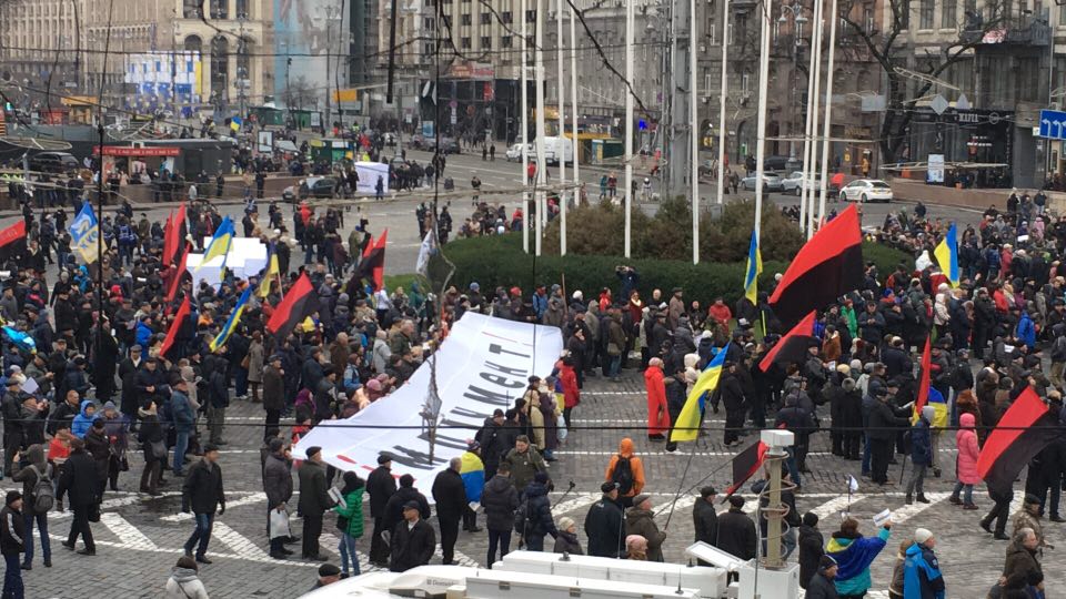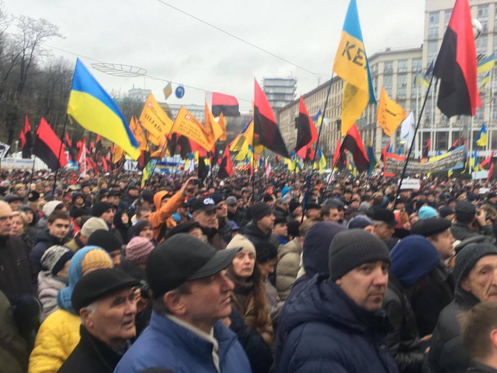 12:09  Сейчас митингующие выстраиваются в колону на перекрестке улицы Владимирской и Проспекта победы. Выйдут через бульвар Шевченко на Крещатик и пройдут до аллеи героев Небесной сотни. А потом пойдут на Банковую к Порошенко.