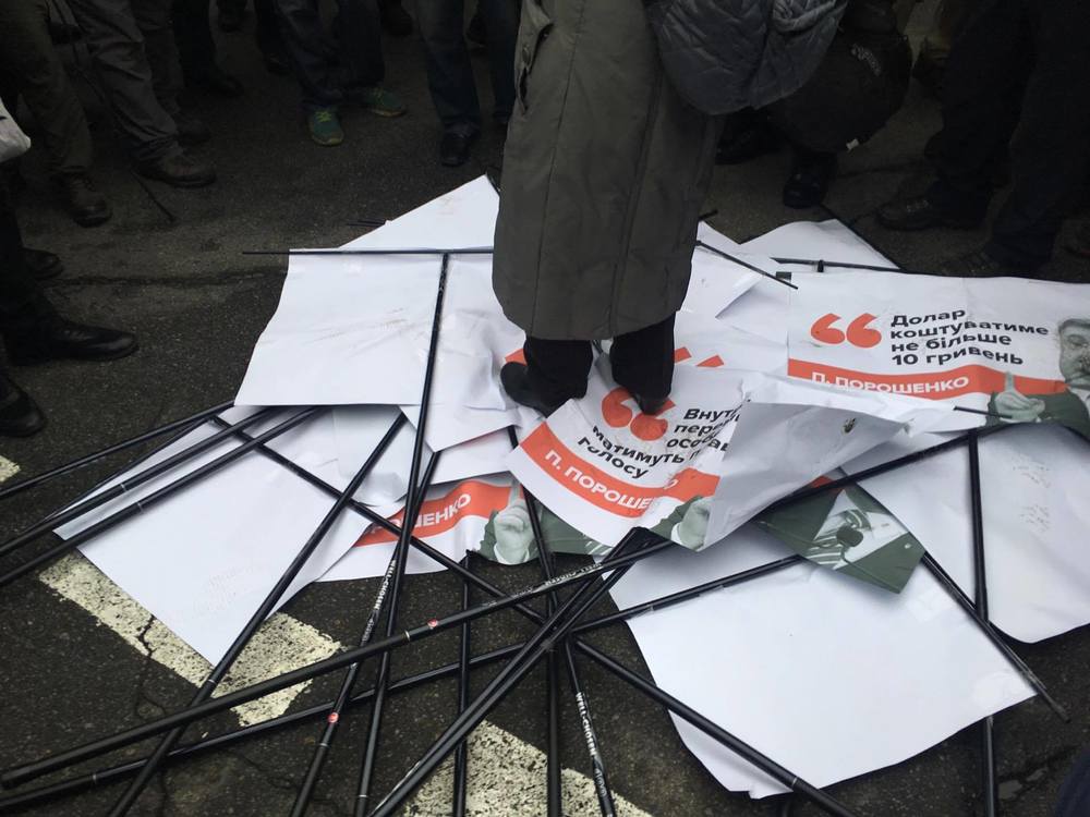 13:18  Начали бросать транспаранты в круг из митингующих с криками "Позор". Теперь весь МихоМайдан будет их топтать. По задумке организаторов, по "тысяче в день" от Порошенко пройдется вся процессия.