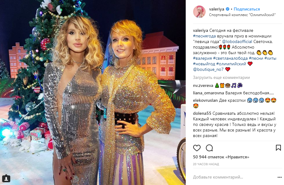 "Сегодня на фестивале "Песня года" вручала приз в номинации "Певица года" Лободе. Светочка, поздравляю! Абсолютно заслуженно - это был твой год", - написала Валерия.
