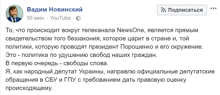 "То, что происходит вокруг телеканала NewsOne, является прямым свидетельством того беззакония, которое царит в стране и, той политики, которую проводят президент Порошенко и его окружение. Это - политика по удушению свобод наших граждан. В первую очередь - свободы слова. Я, как народный депутат Украины, направлю официальные депутатские обращения в СБУ и ГПУ с требованием дать правовую оценку происходящему", написал Вадим Новинский.