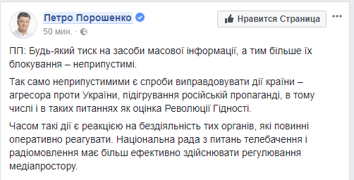 "Любое давление на средства массовой информации, а тем более их блокировка - недопустимы. Также недопустимы попытки оправдывать действия страны-агрессора против Украины, подыгрывание российской пропаганде, в том числе и в таких вопросах как оценка Революции Достоинства", - написал Порошенко.