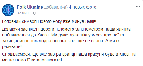 "Главный символ Нового Года уже проезжает Львов! Преодолевая заснеженные дороги, километр за километром наша елка приближается к Киеву", - говорится в сообщении.