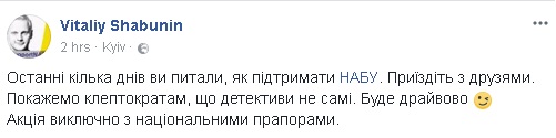 "Последние несколько дней вы спрашивали, как поддержать НАБУ. Приезжайте с друзьями. Покажем клептократам, что детективы не одни. Будет драйвово", - написал антикоррупционер.