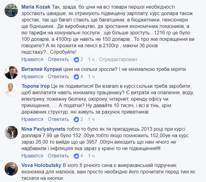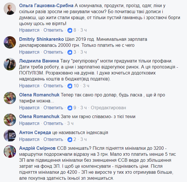 "ЕСВ уменьшат? После поднятия минималки до 3200 - маршрутки подорожали сразу на 3 грн. Мало кто платит меньше 5 тыс ЗП но повышение минималки без уменьшения ЕСВ ведет к увеличению затрат на фонд ЗП. И чтобы это компенсировать - поднимают цены. После поднятия минималки до 4200 - ЗП не вырастет у тех, кто получал больше, но покупная способность их зп уменьшится", - написал пользователь Андрей.
