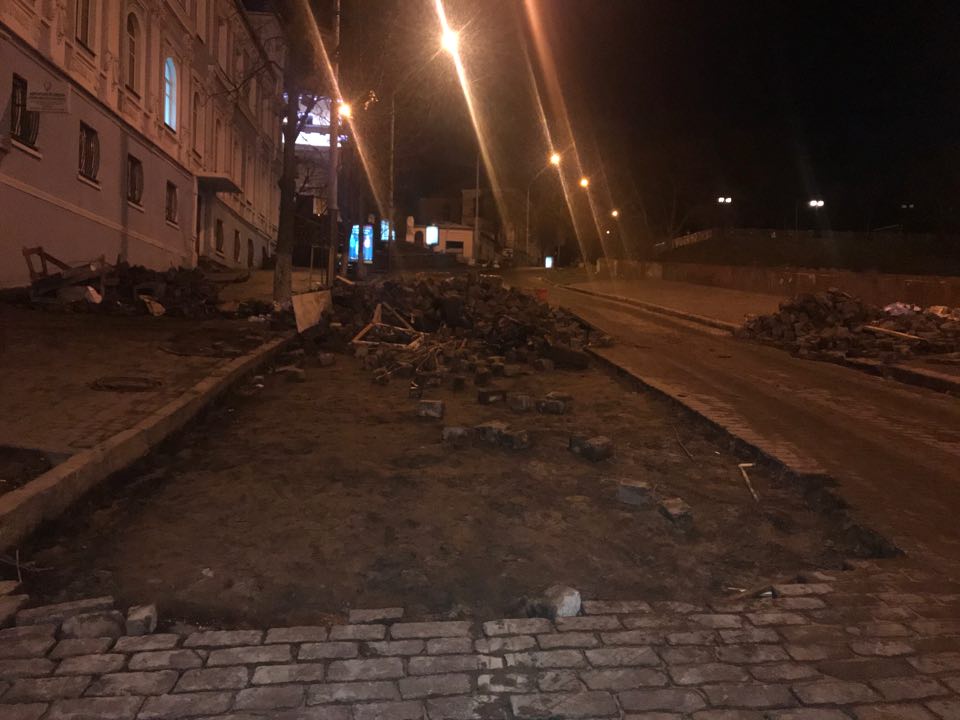 На дороге лежат разбитые бетонные клумбы, которыми перекрывали  дорогу автомобилям СБУ, также снята брусчатка с проезжай части.