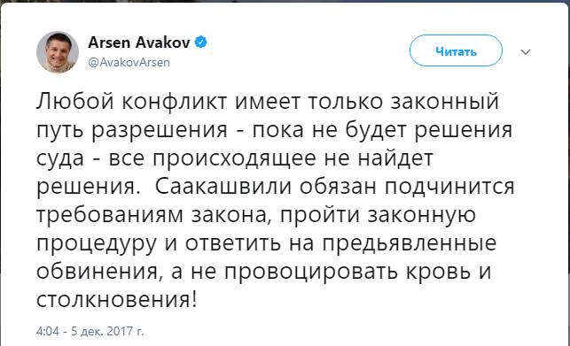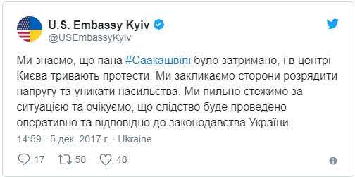 "5 декабря 2017 сотрудники # СБУ совместно с Генеральной прокуратурой Украины в рамках уголовного производства, открытого по ч. 1 ст. 256 Уголовного кодекса Украины, задержали по месту жительства в Киеве Саакашвили.