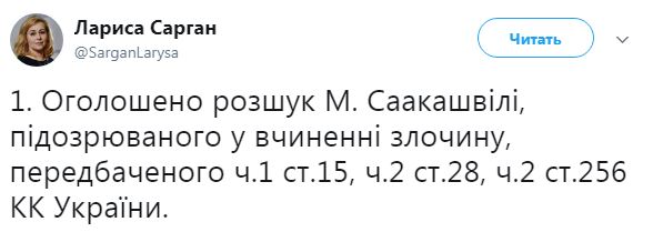 9:13  Прокуратура разыскивает Саакашвили по трем статьям Уголовного кодеса, написала в соцсетях спикер генпрокурора Лариса Сарган.