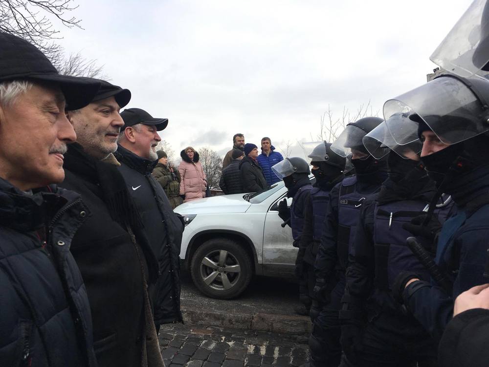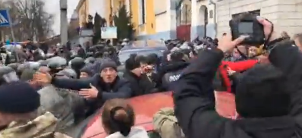 10:30  Машина с Михо около костела. Там два полукольца людей - правоохранители и сторонники Саакашвили. Силовики пробуют оттеснить людей, мешающих проезду. В машину, где его везут, ранее бросили камень, повредили лобовое стекло. Машина пытается повернуть на ул. Трехсвятительскую, противники пытаются этому воспрепятствовать.