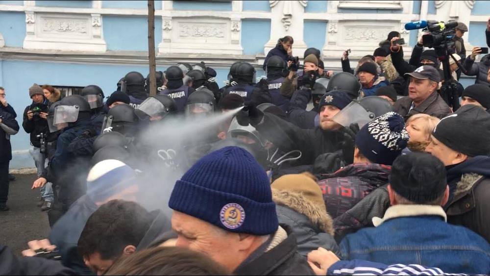 11:15  Полиция начала поливать людей газом. Пара человек пострадали. Активисты пытаются отвечать и что-то бросают. Ведущий образается к начальнику полиции Киева Зозуле и требует отвести силовиков. "Зозуля, забери своих шакалов! Провокатор аваковский!"