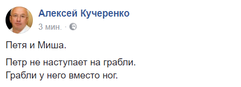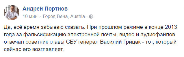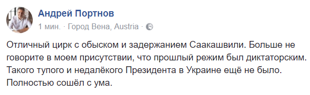 10:19  "Отличный цирк с обыском и задержанием Саакашвили. Больше не говорите в моем присутствии, что прошлый режим был диктаторским. Такого тупого и недалёкого Президента в Украине ещё не было. Полностью сошёл с ума", - пишет в Facebook адвокат Андрей Портнов.