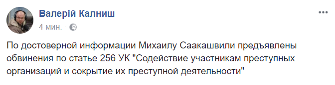 "По достоверной информации Михаилу Саакашвили предъявлены обвинения по статье 256 УК "Содействие участникам преступных организаций и сокрытие их преступной деятельности"", - написал Калныш у себя в Facebook.