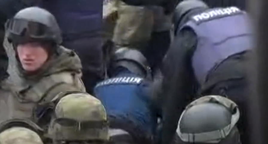 9:58  Столкновения уже и в подъезде. Слышен голос Михо: "Це злочинці!". Его выносят из подъезда альфовцы.