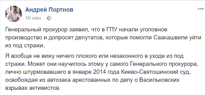 Я вообще не вижу ничего плохого или незаконного в уходе из под стражи. Может они научилось этому у самого Генерального прокурора, лично штурмовавшего в январе 2014 года Киево-Святошинский суд, освобождая из автозака арестованных по делу о Васильковских взрывах активистов", - написал в Facebook адвокат Андрей Портнов.