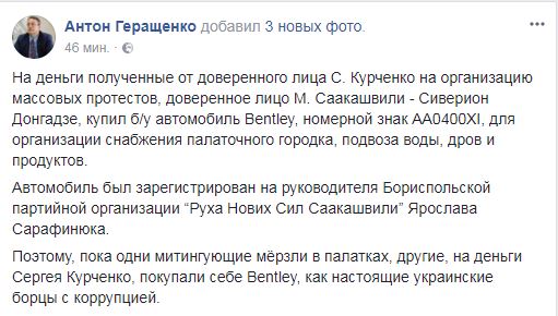 "На деньги, полученные от доверенного лица С.Курченко на организацию массовых протестов, доверенное лицо М.Саакашвили Сиверион Донгадзе купил б/у автомобиль Bentley , номерной знак АА0400ХІ, для организации снабжения палаточного городка, подвоза воды, дров и продуктов", - написал Геращенко.
