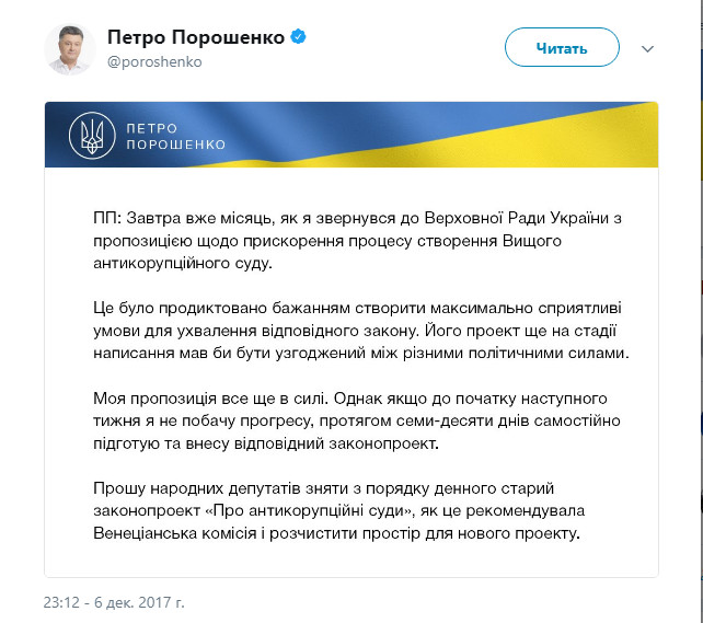 "Мое предложение все еще в силе. Однако если до начала следующей недели я не увижу прогресса, в течение семи-десяти дней самостоятельно подготовлю и внесу соответствующий законопроект. Прошу народных депутатов снять с повестки дня старый законопроект "Об антикоррупционном суде", как это рекомендовала Венецианская комиссия и расчистить пространство для нового проекта", - подчеркнул Порошенко.