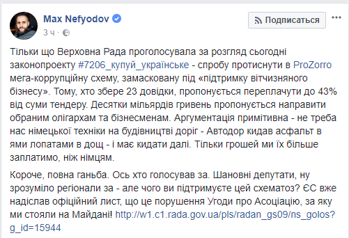 "Тому, кто соберет 23 справки, предлагается переплачивать до 43% от суммы тендера. Десятки миллиардов гривен предлагается направить избранным олигархам и бизнесменам. Аргументация примитивная - не надо нам немецкой техники на строительстве дорог - Автодор бросал асфальт в ямы лопатами в дождь - и должен бросать дальше. Только денег мы им больше заплатим, чем немцам", - пишет Нефедов.