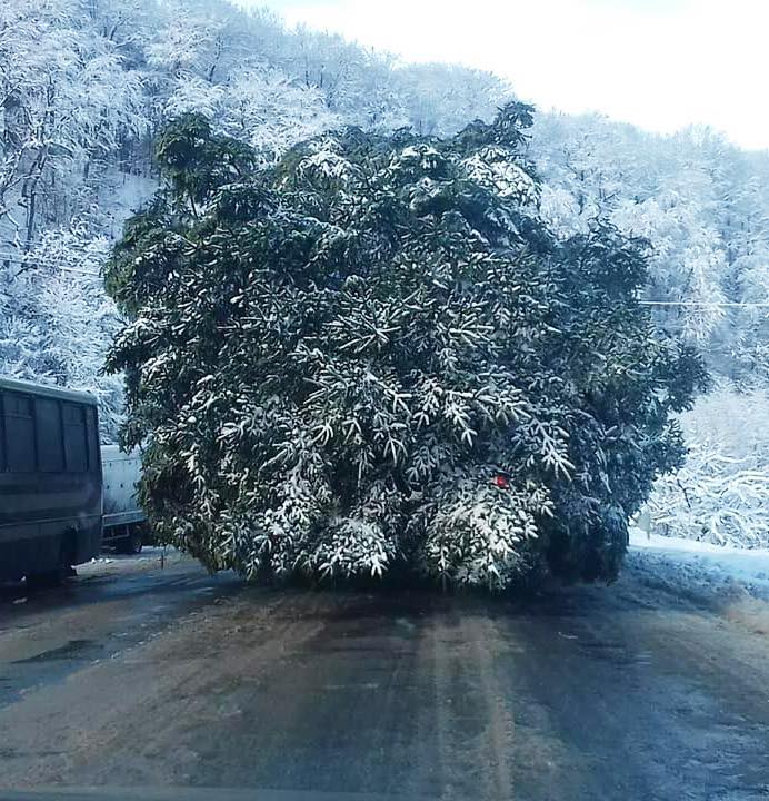 Шел снег, а машина с деревом занимала две с половиной полосы дороги. Машина с елкой прибыла в Киев только в ночь на 6 декабря.