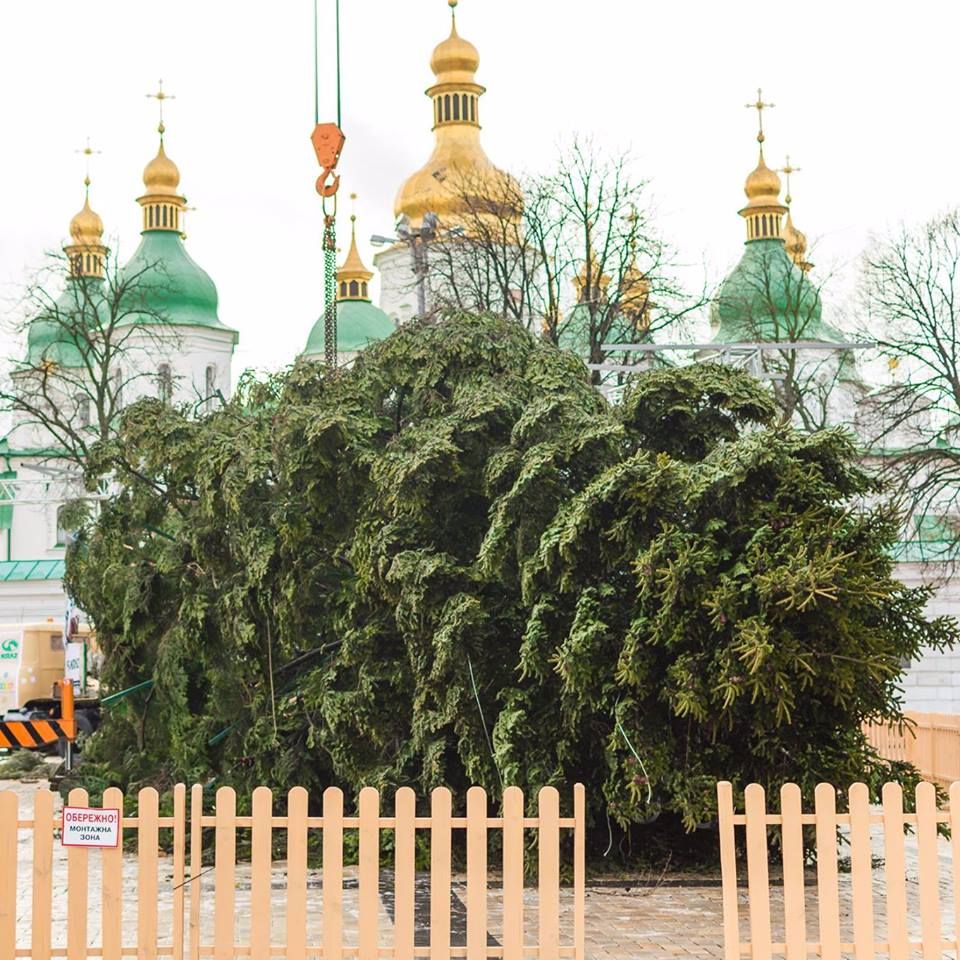 В Киеве на Софийской площади уже установили главную новогоднюю елку страны. Ее привезли вчера, 6 декабря, а украшать начнут в это воскресенье. А пока что елка стоит со связанными ветками. Это объясняют тем, что иначе у дерева увеличится "парусность", и оно может упасть из-за ветра. Ее традиционно откроют на день святого Николая 19 декабря.