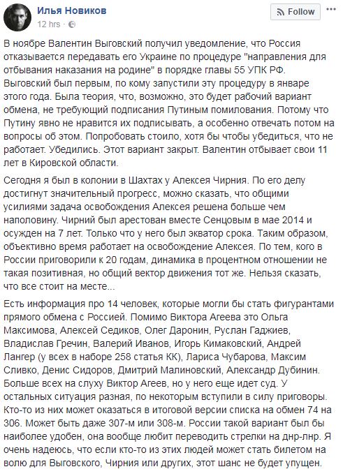 "В ноябре Валентин Выговский получил сообщение, что Россия отказывается передавать Украине по процедуре «направления для отбывания наказания на Родине» в порядке главы 55 УПК РФ", - написал адвокат.