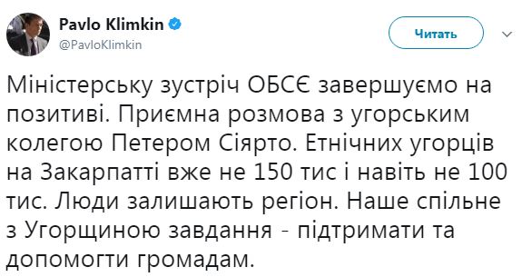 "Министерскую встречу ОБСЕ завершаем на позитиве. Приятный разговор с венгерским коллегой Петером Сийярто. Этнических венгров в Закарпатье уже не 150 тысяч и даже не 100 тысяч. Люди покидают регион. Наша общая с Венгрией задача - поддержать и помочь общинам", - написал он.