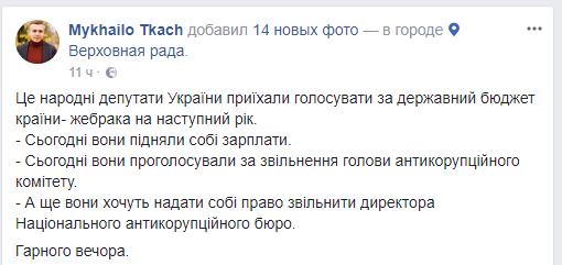 "Это народные депутаты Украины приехали голосовать за государственный бюджет нищей страны на следующий год. Сегодня они подняли себе зарплаты. Сегодня они проголосовали за увольнение председателя антикоррупционного комитета. А еще они хотят предоставить себе право уволить директора Национального антикоррупционного бюро. Хорошего вечера", - написал 7 декабря Ткач.