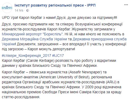 "Друзья, просим поддержать нас и спикера Всеукраинской конференции журналистов-расследователей Карол Кербаг. Журналистку задержали в Международном аэропорту "Борисполь". Ни ей, ни нам ничего не объясняют в Государственной миграционной службе Украины и Государственной пограничной службы Украины! Документы, приглашение - все в порядке! Ее участие в конференции под угрозой - Карол могут депортировать", - сообщил ИРРП.