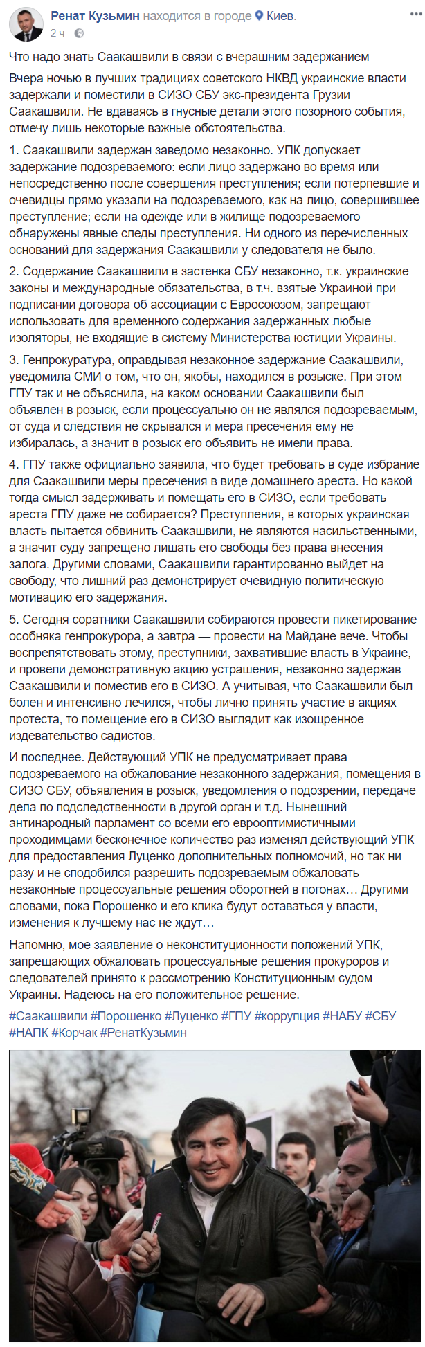"Вчера ночью в лучших традициях советского НКВД украинские власти задержали и поместили в СИЗО СБУ экс-президента Грузии Саакашвили. Не вдаваясь в гнусные детали этого позорного события, отмечу лишь некоторые важные обстоятельства", пишет Кузьмин.