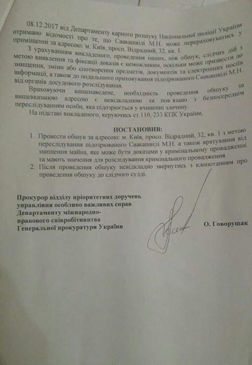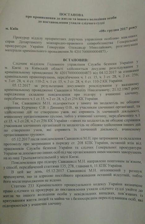 1. Саакашвили задержан заведомо незаконно. УПК допускает задержание подозреваемого: если лицо задержано во время или непосредственно после совершения преступления; если потерпевшие и очевидцы прямо указали на подозреваемого, как на лицо, совершившее преступление; если на одежде или в жилище подозреваемого обнаружены явные следы преступления. Ни одного из перечисленных оснований для задержания Саакашвили у следователя не было.