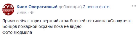 "Прямо сейчас горит верхний этаж бывшей гостиница "Славутич". Бойцов пожарной охраны пока не видно", - говорится в сообщении.