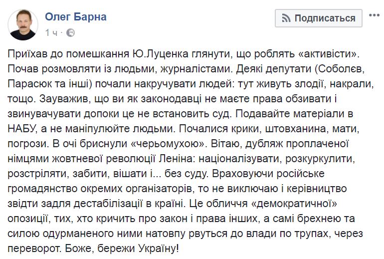 "Нардеп Барна все же приехал к дому Луценко, как всегда спровоцировал людей и получил газом в лицо", - говорится в сообщении.