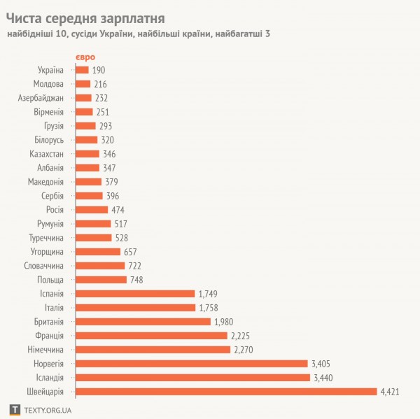 В качестве критерия специалисты выбрали уровень зарплат, изучив заработок жителей европейских стран после выплаты налогов. Выяснилось, что в Украине эта сумма является самой низкой - 190 евро. Второе и третье места занимают Молдова (216 евро) и Азербайджан (232 евро).