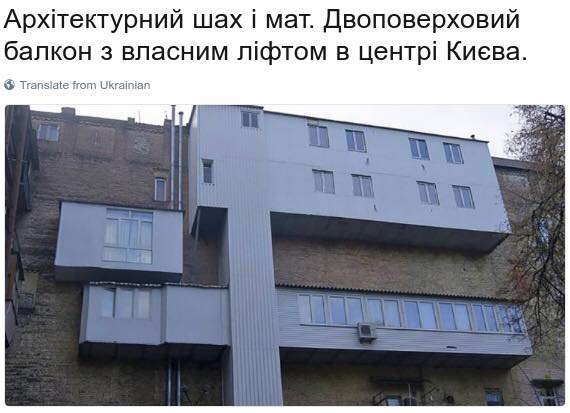 "Архитектурный шах и мат. Двухэтажный балкон с собственным лифтом в центре Киева", — говорится в описании к фото.