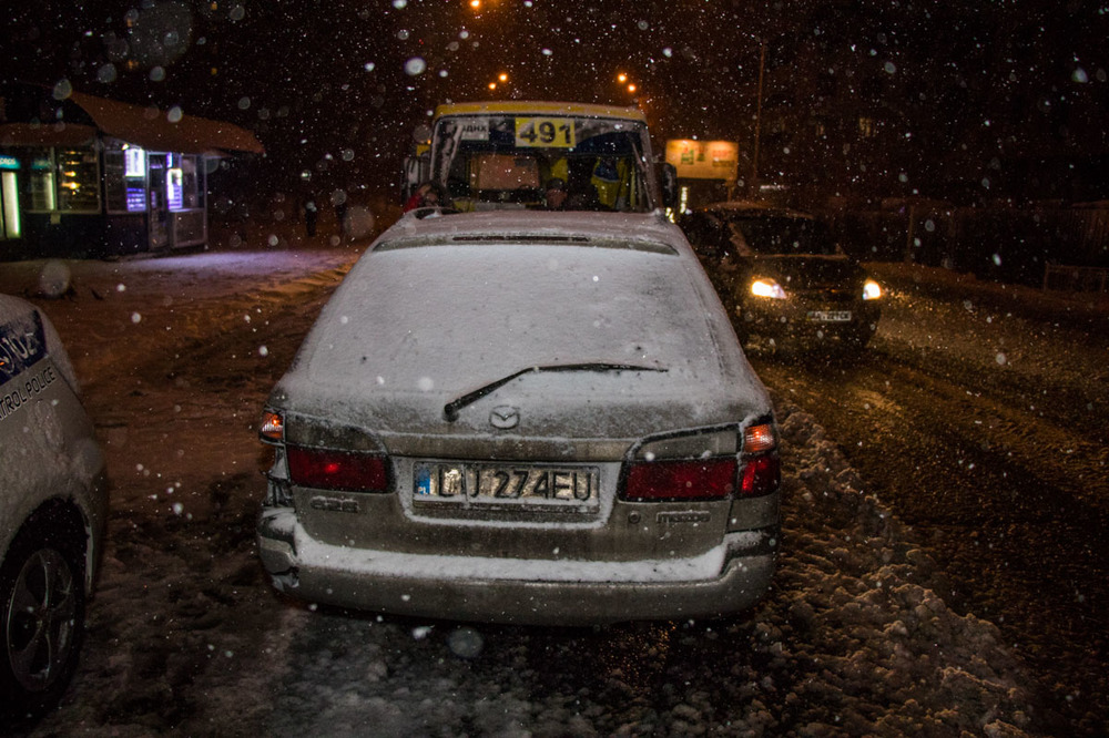 Маршрутка № 491 выезжала с остановки, ей навстречу ехала Mazda на польских номерах. Легковушку резко начало крутить на дороге. Она ударилась задом о припаркованный эвакуатор и въехала под маршрутку. "Мне сразу было не до автомобиля. У меня в салоне ехало 8 детей с мамочками. Я сразу посмотрел, не пострадал ли кто. Но к счастью, они все целы", - рассказал водитель маршрутки Иван.