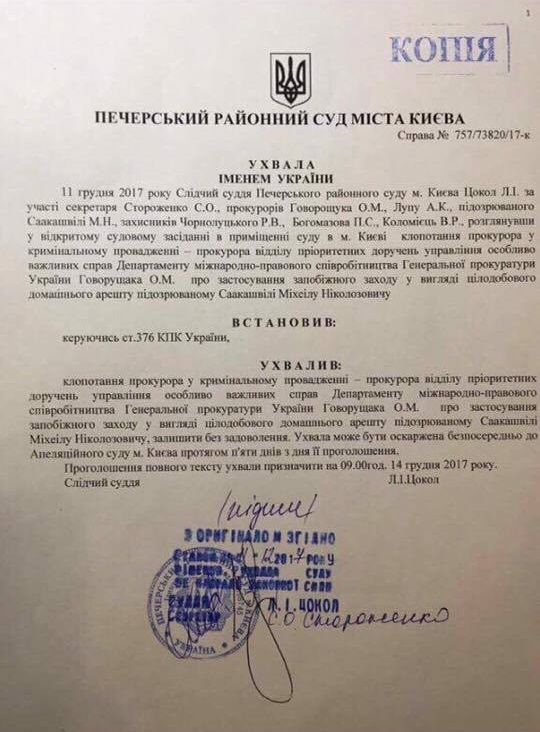 В документе сказано, что определение суда может быть обжаловано в течение пяти дней непосредственно в Апелляционом суде Киева.