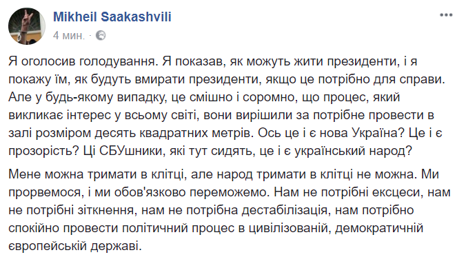 "Я объявил голодовку. Я показал, как могут жить президенты, и я покажу им, как будут умирать президенты, если нужно для дела. Но в любом случае, это смешно и стыдно, что процесс, который вызывает интерес во всём мире, они решили, что нужно провести в зале размеров десять квадратных метров. Вот это и есть новая Украина? Это и есть прозрачность? Эти СБУшники, которые тут сидят, это и есть украинский народ?