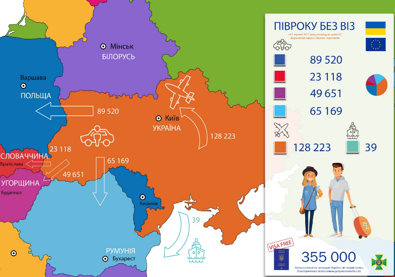 В рамках безвизового режима больше всего украинцы направлялись через границу с Польшей и Румынией - почти 90 000 и 65 000 человек соответственно.