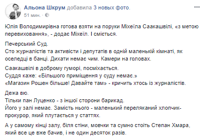 "Юлия Владимировна готова взять на поруки Саакашвили "с целью перевоспитания", добавил Михаил. И смеется", - написала Шкрум, которая находится в зале Печерского районного суда Киева.